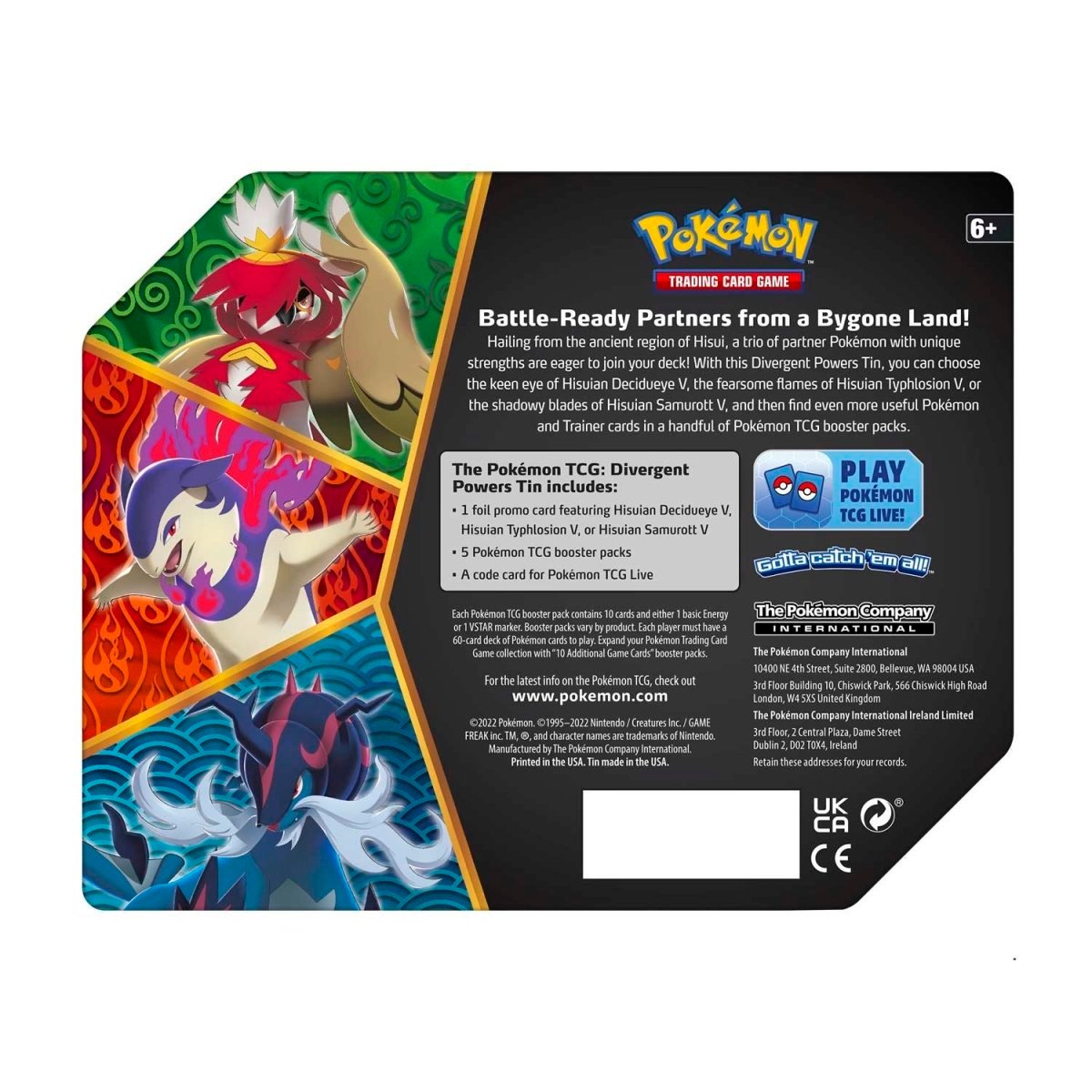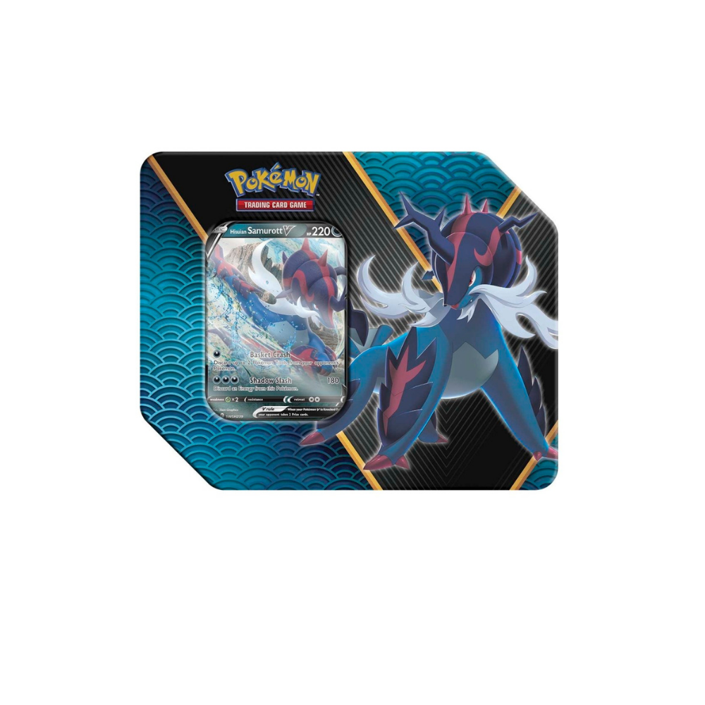 Hailing from the ancient region of Hisui, a partner Pokémon with unique strengths is eager to join your deck! With this Divergent Powers Tin, you can choose the shadowy blades of Hisuian Samurott V and then find even more useful Pokémon and Trainer cards in a handful of Pokémon TCG booster packs.