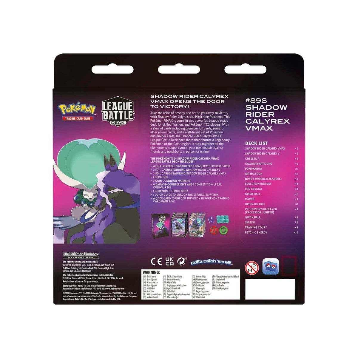 The Pokémon TCG: Shadow Rider Calyrex VMAX League Battle Deck includes: